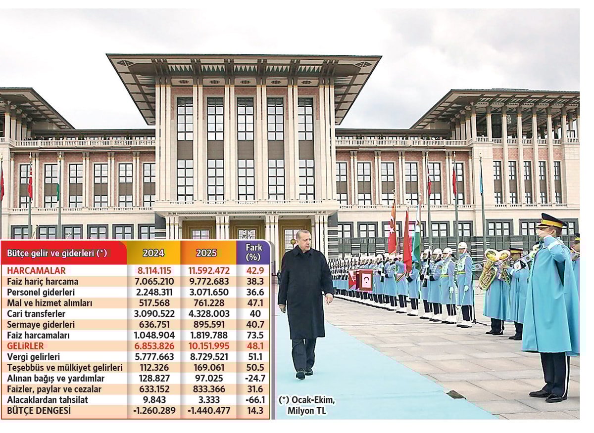 Yılın bitimine iki ay kala bütçe açığı 1.4 trilyonla, faiz giderleri 1.8 trilyonla rekor kırdı. Saray 10 ayda kendi bütçesinden 12.3 milyar TL, örtülü ödenekten de 12.5 milyar lira para harcadı.