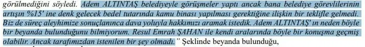 “Resul Emrah Şahan ile hiç görüşmedim. Belediyeden sadece talebimin uygun görülmediği söylendi. Hiçbir belediye görevlisi bizden herhangi bir bedel ya da kamu binası yapımı talep etmedi. Adem Altıntaş neden böyle bir beyanda bulundu bilmiyorum.”