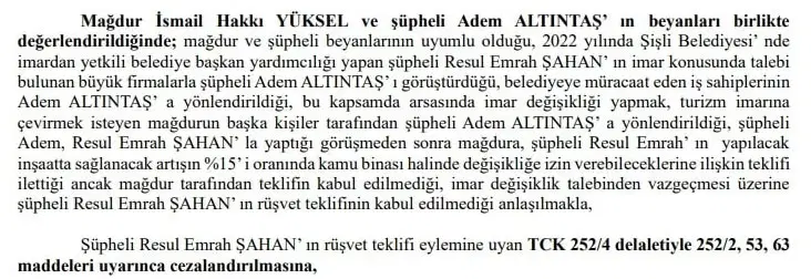 İBB iddianamesinde, Şişli Belediye Başkanı Resul Emrah Şahan hakkında rüşvet suçlaması yer aldı. Ancak dosyada adı geçen şirket yetkilisi, rüşvet talebinde bulunulmadığını açıkça belirtti. İmar müdürü de plan değişikliğinin Şişli Belediyesi’nin yetkisinde olmadığını söyledi. Buna rağmen savcılık Şahan hakkında ceza talep etti.