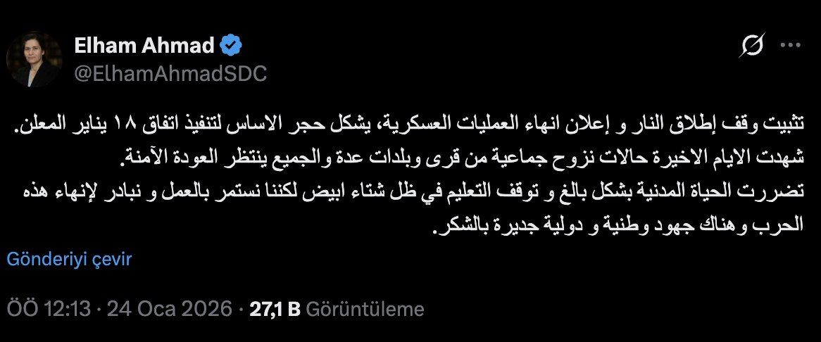 Kuzey ve Doğu Suriye Özerk Yönetimi Dış İlişkiler Dairesi Eş Başkanı İlham Ahmed, 18 Ocak Anlaşması ve sahadaki insani duruma ilişkin açıklamalarda bulundu. Ahmed, anlaşmanın uygulanmasının temel şartının ateşkesi kalıcı hâle getirmek ve operasyonları sona erdirmek olduğunu vurgulayarak, savaşı bitirmek için çabalarını sürdürdüklerini belirtti.
