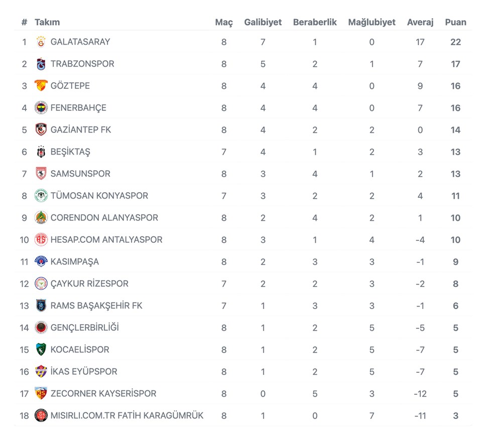 Lider Galatasaray, Beşiktaş karşısında 1-1 berabere kalarak puanını 22’ye çıkardı ve zirvedeki yerini korudu. Göztepe, RAMS Başakşehir’i 1-0 mağlup ederken, Samsunspor Fenerbahçe ile golsüz berabere kaldı.